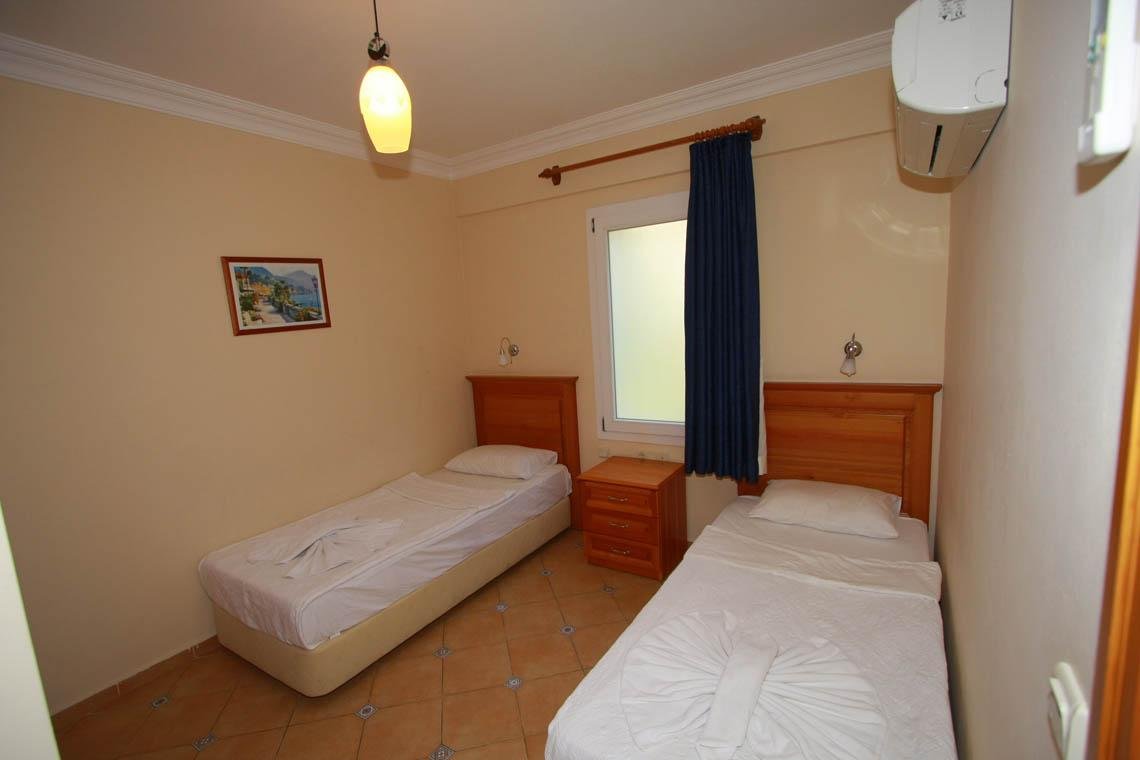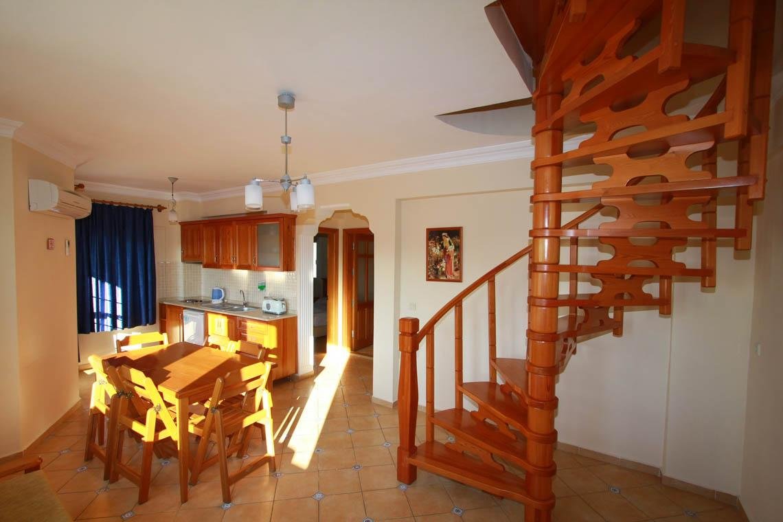In this splendid apartment the lower floor has one double bedroom (including a child’s bed) plus one twin bedroom. The well-designed, spacious living area has a single sofa bed, flat screen TV, air conditioning, direct dial telephone, fully equipped open-plan kitchen, deluxe bathroom and a balcony with table, chairs and views of the pool and mountains.